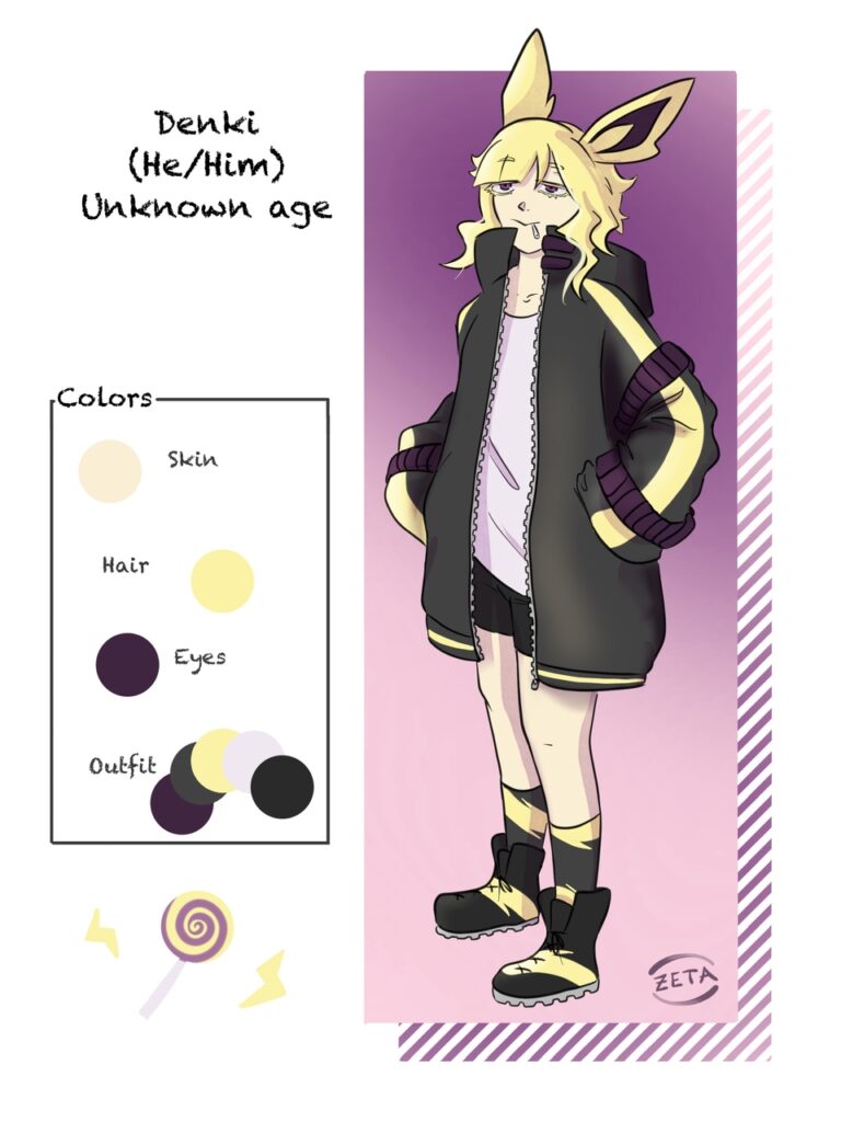 Denki has been designed by Lunasteria (https://linktr.ee/ByronLunasteria) from the Pokemon Jolteon.